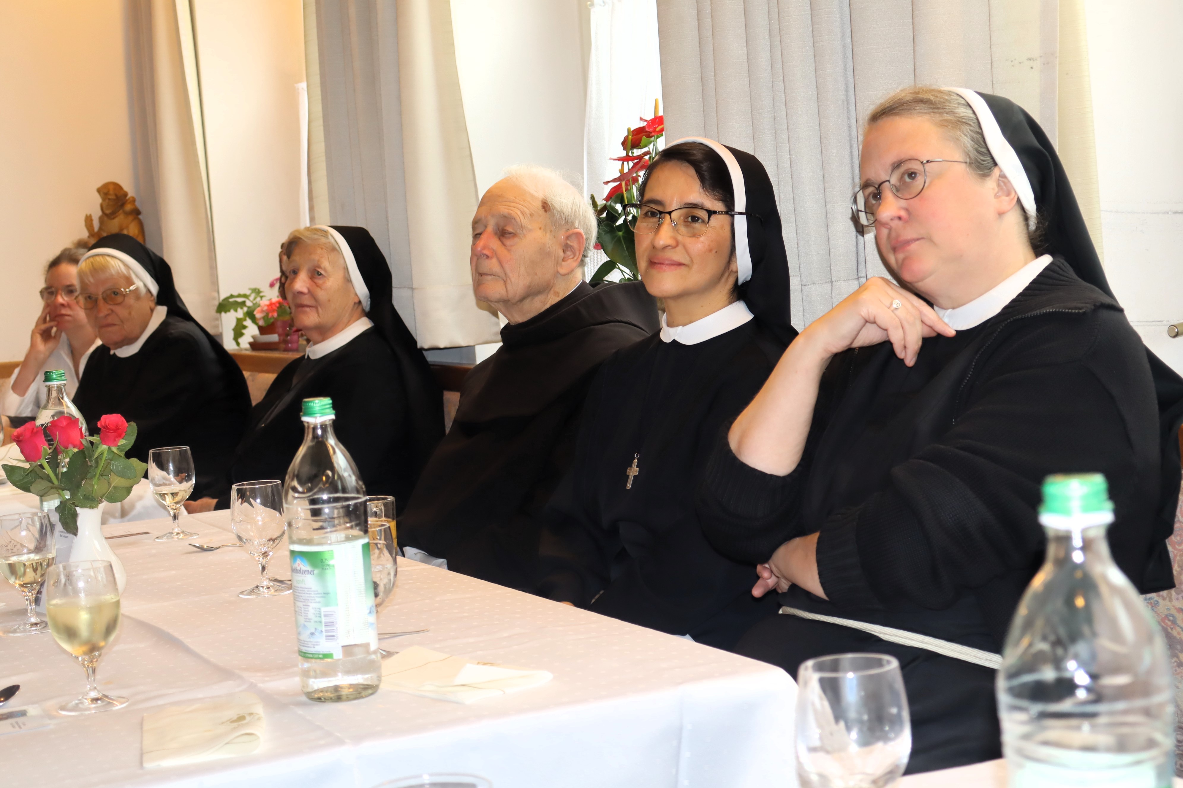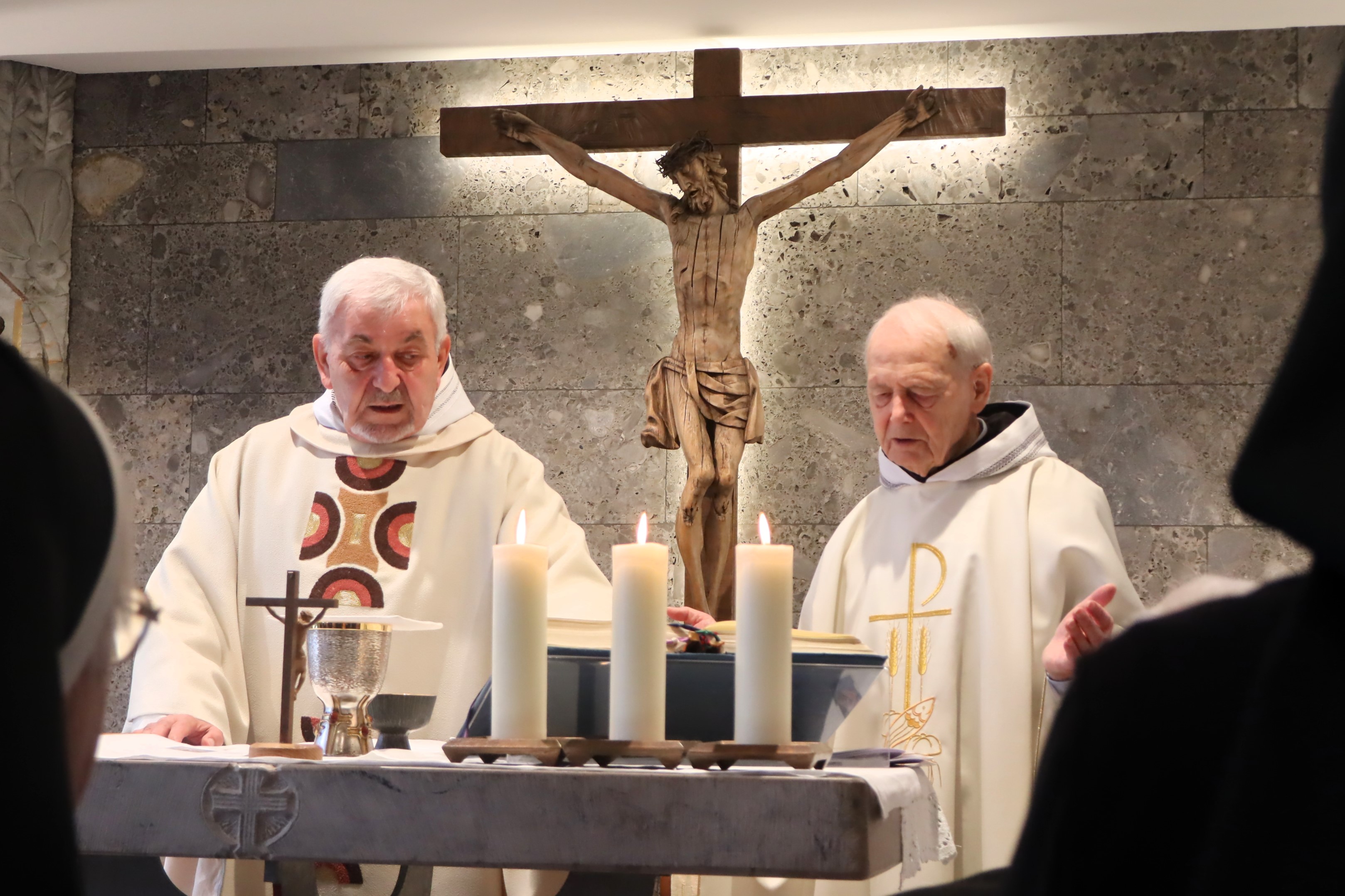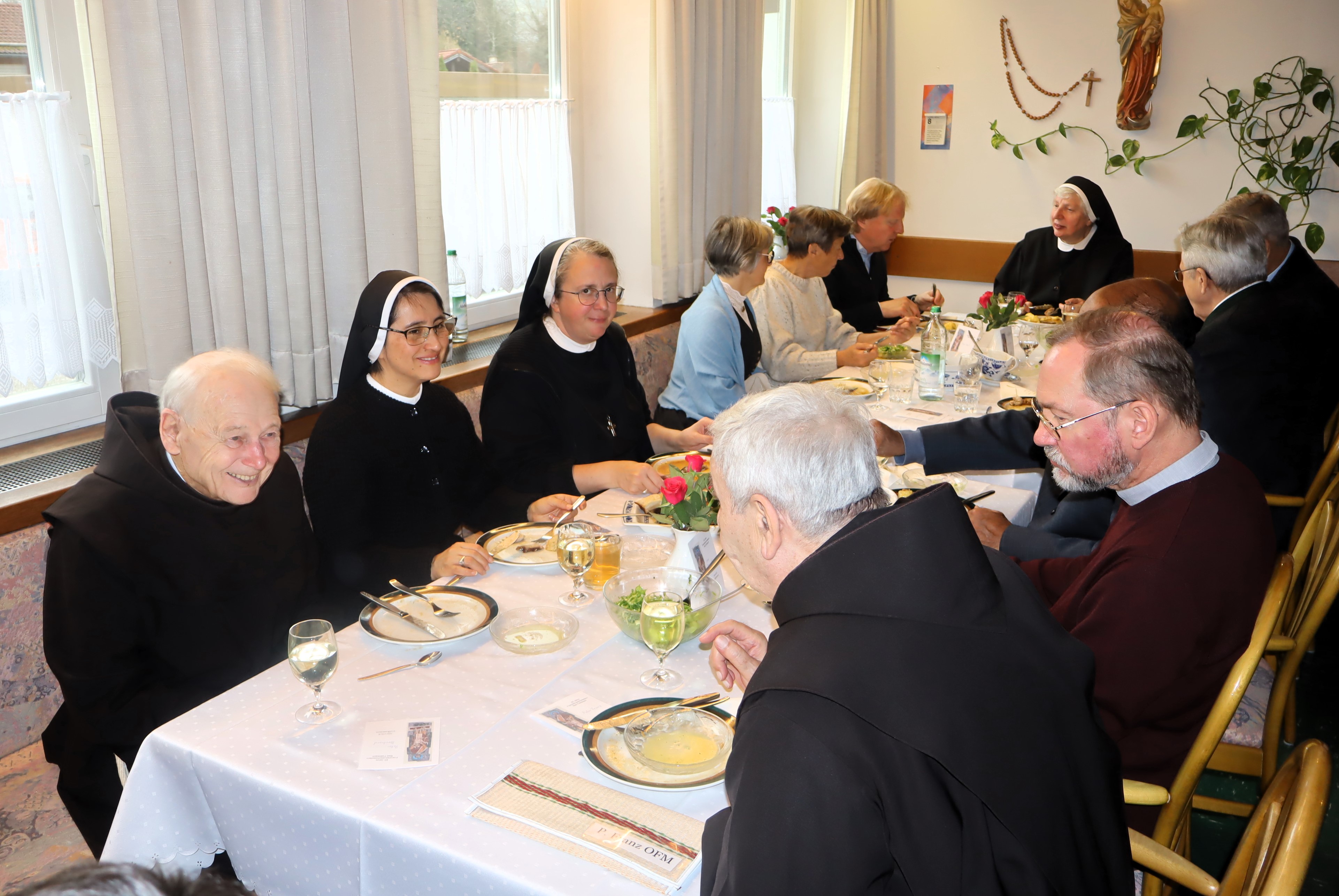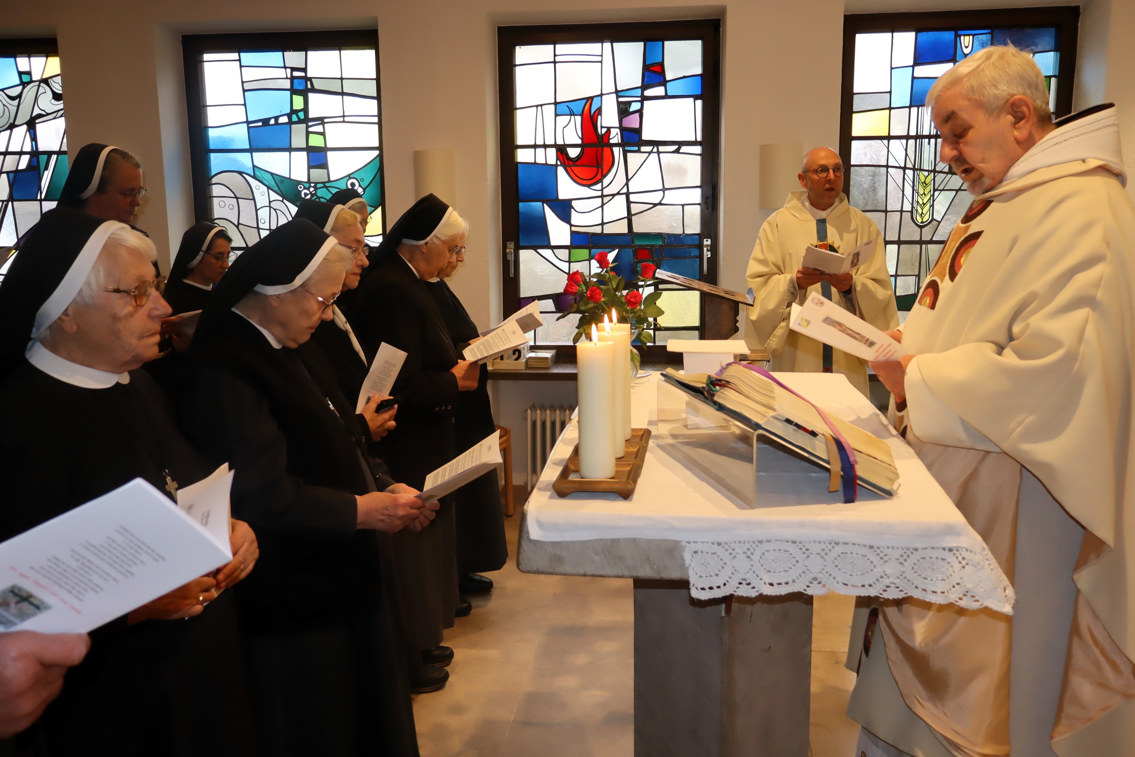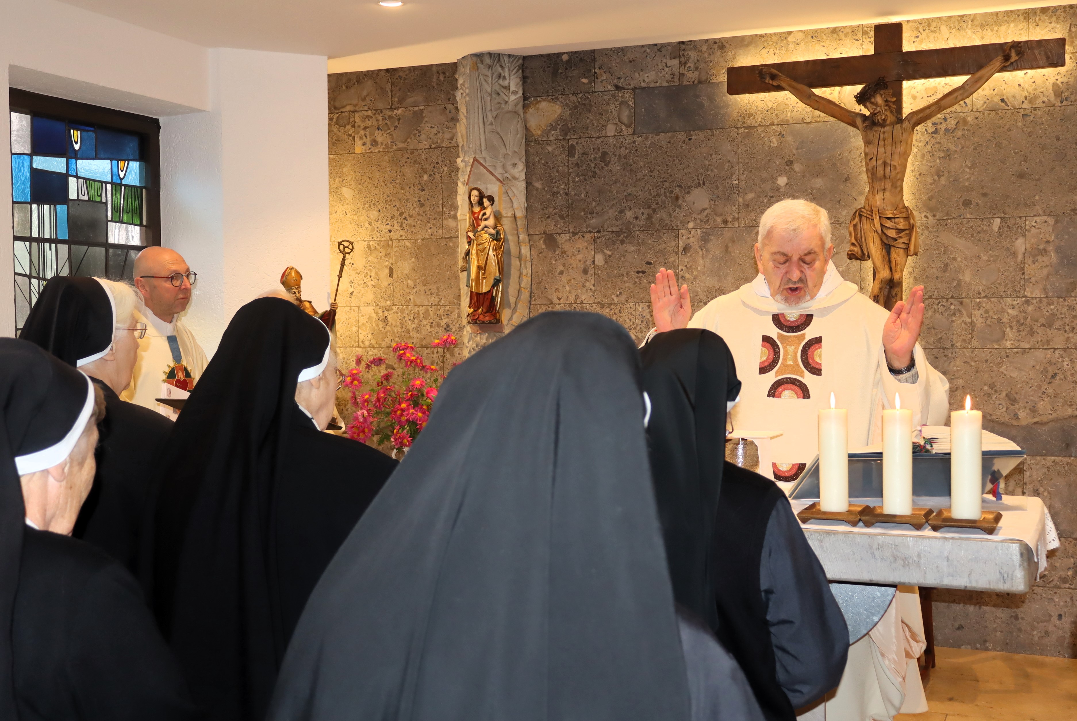 Klöster gelten heutzutage eher als Relikte aus vergangenen Tagen, sind jedoch immer noch Orte für Weggemeinschaften und Erwartende mit dem Anspruch auf sich führen lassen, wie Pater Franz seine Predigt beim Dankgottesdienstes in der renovierten hell gestalteten Hauskapelle einleitete. Ordensgemeinschaften waren in Zeiten geprägt von materiellen und sozialen Beeinträchtigungen unverzichtbare und wichtige Begleiter. Die Kultur des Wohlstand brachte Veränderungen mit sich, die Christen auffordern, die Augen mit Blick ins Weltgeschehen zu öffnen und wach zu halten. Ordensgemeinschaften verbreiten auch in der Gegenwart Lebensfreude und sind Zeichen für den Weg zum Herrn. Klöster bestehen nicht aus Steinen, sondern von Schwestern die wiederkehrend beten und Bedürftigen mit ihrer gemeinschaftlichen Spiritualität Hilfe angedeihen lassen, so der Hausgeistliche abschließend.