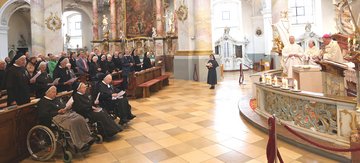 Sechs wunderschöne, für den besonderen Anlass gefertigte Kerzen brannten auf der Chorbank des Gnadenaltars vor den Jubilarinnen, als Erzbischof Herwig Gössl den Festgottesdienst eröffnete. Mitzelebranten waren Spiritual Pater Bernhard Braun OFM, Pater Stefan Panzer, die evangelische Pfarrerin Verena Winkler, Pfarrer Albert Müller sowie Pfarrer Reinhard Forster und Pater Ludwig Dehez SJ. Die musikalische Begleitung übernahm Georg Hagel an der Rieger-Orgel. „Jubiläen sind dazu angetan, die Jubilarinnen zu ehren und dabei möglichst alles hervorzuheben, was sie im Leben geleistet haben. Ich bin mir sicher, da gäbe es im Leben unserer Jubilarinnen einiges zu entdecken und zu bejubeln. Doch es ist nicht Sinn und Zweck einer Predigt, Lobreden auf Menschen zu halten, sondern vielmehr das Wort Gottes zu verkündigen in einer bestimmten Situation hinein – heute in die Situation dieser Jubelfeier“, erklärte Erzbischof Herwig Gössl zu Beginn seiner Predigt.